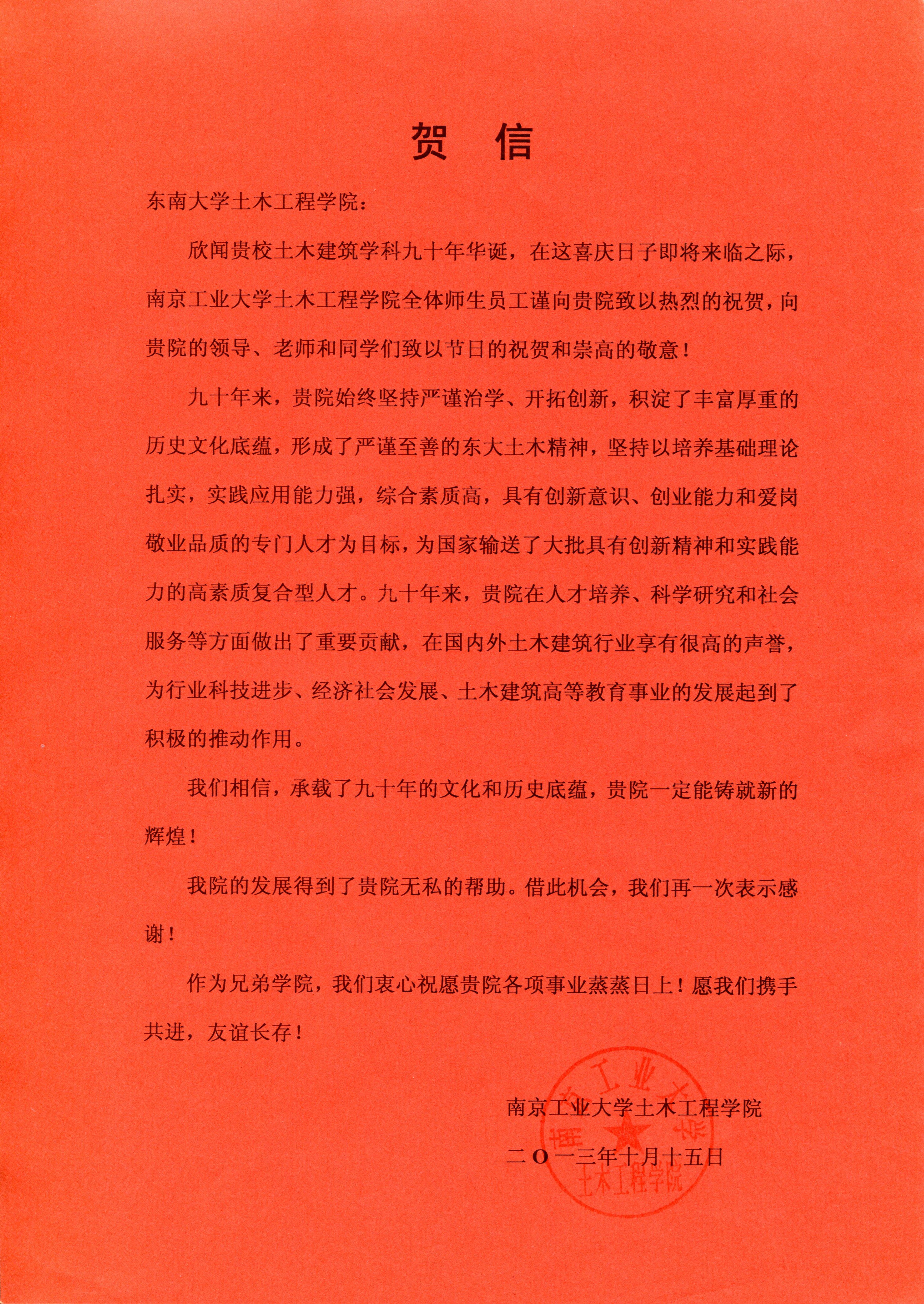南京工业大学土木学院的贺信