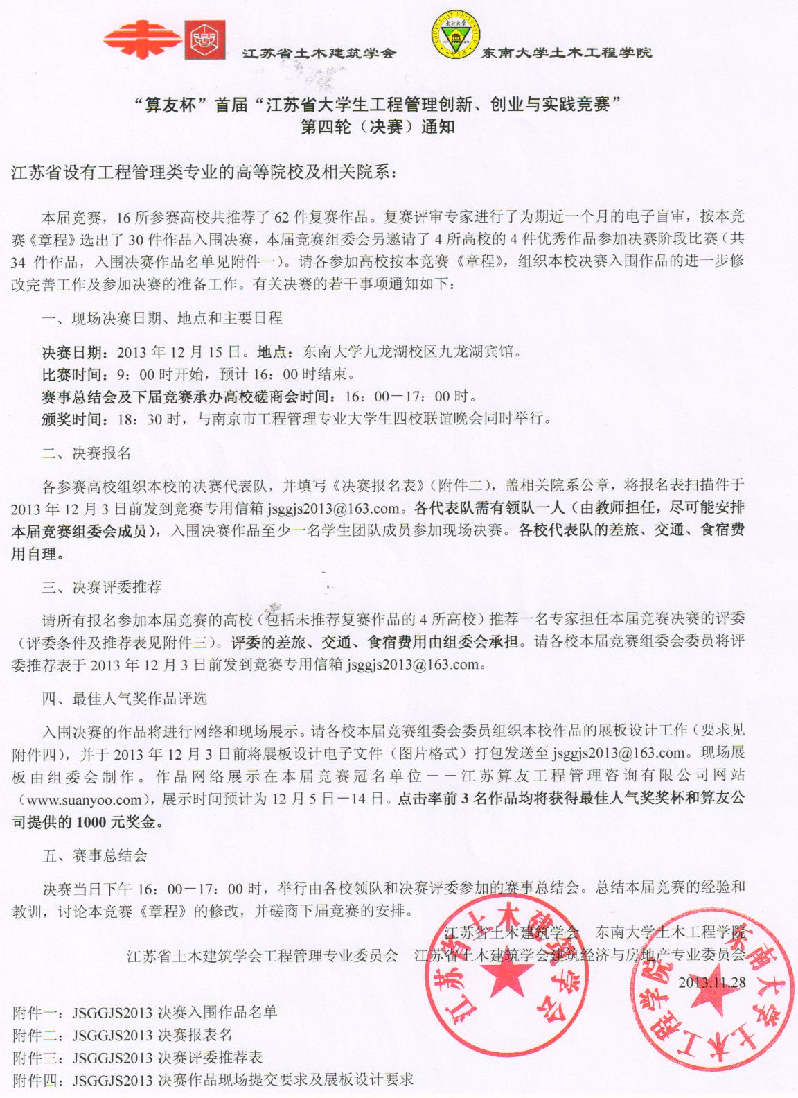 “算友杯”首届“江苏省大学生工程管理创新、创业与实践竞赛”第四轮(决赛)通知