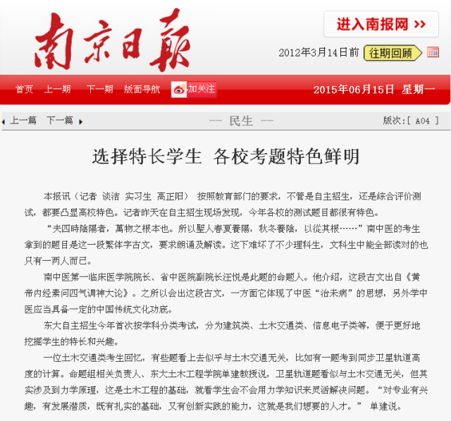 【编者按】今年自主招生的做法与往年相比有很大的变化,如招生高校的考核改在高考之后,成绩公布之前进行;考核工作由招生学校的各个学科自己负责。这样做的一个重要目的就是突出学科特色,注重考核考生的专业方面特长。新闻媒体对此特别关注,在我们自主招生考试笔试开始后,就有多家媒体对土木交通类自主招生笔试命题负责人单建教授进行了采访,南京日报就是其中之一。 |