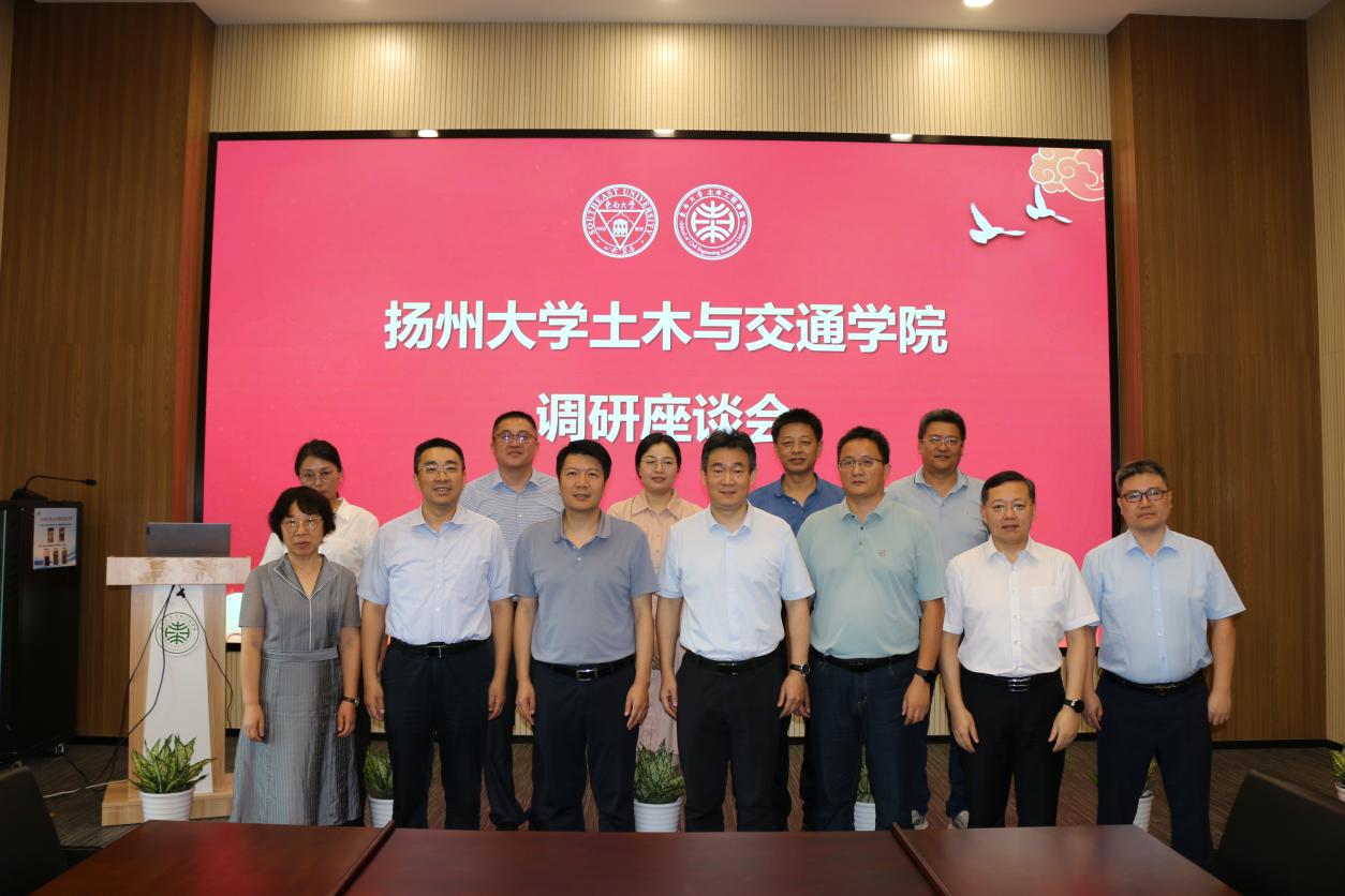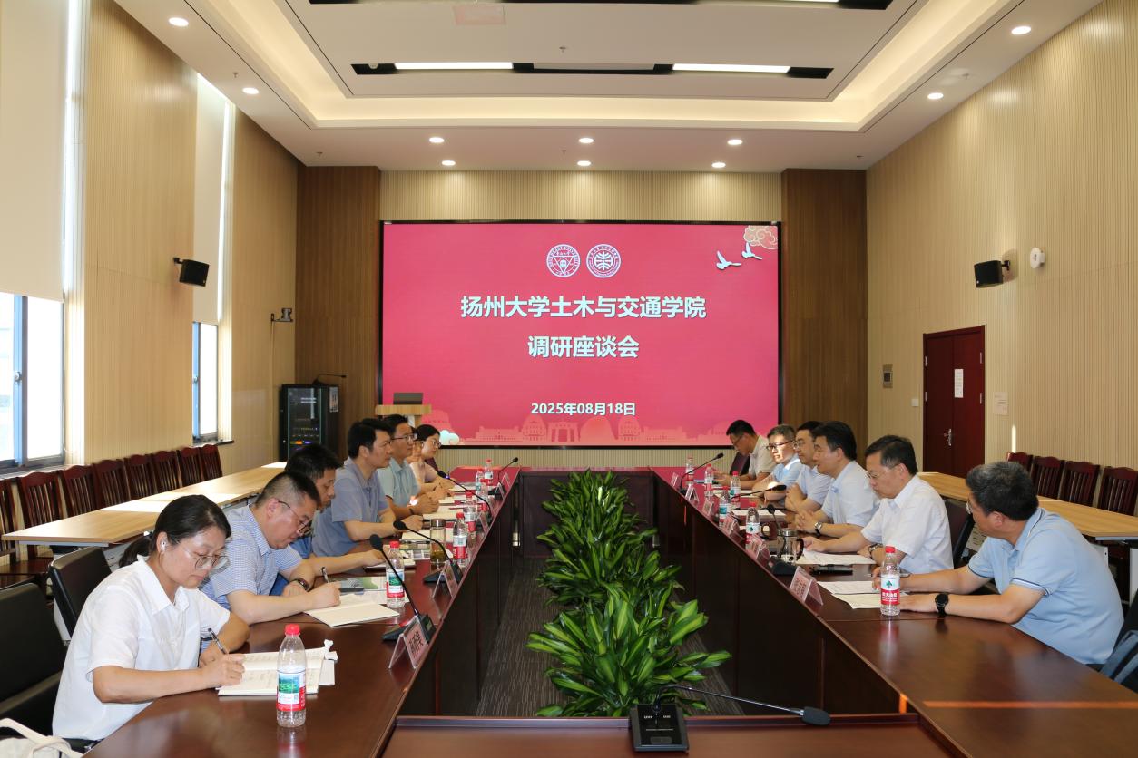8月18日下午,扬州大学土木与交通学院院长邓社军、副院长张兵、实验中心主任吴正光、土木工程系主任李琮琦、工程管理系主任周振国、综合办公室主任徐婷、研究生秘书孙西美一行来我们调研交流。我们院长郭彤、党委副书记(主持工作)汤顶华、副院长黄镇、副院长张文明、建筑工程系党支部书记张志强、实验中心主任徐明出席会议。会议由党委副书记(主持工作)汤顶华主持。