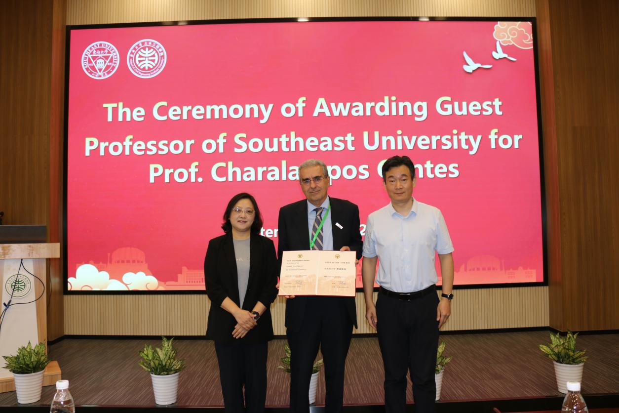 随后举行了隆重的客座教授聘任仪式。Gantes教授作为雅典国立技术大学钢结构研究中心主任、国际壳与空间结构协会(IASS)期刊主编,在可展开与空间结构领域享有广泛的学术影响力。徐健副处长与郭彤院长共同为他颁发聘书、佩戴校徽,正式聘任其为必威BETWAY官网客座教授。